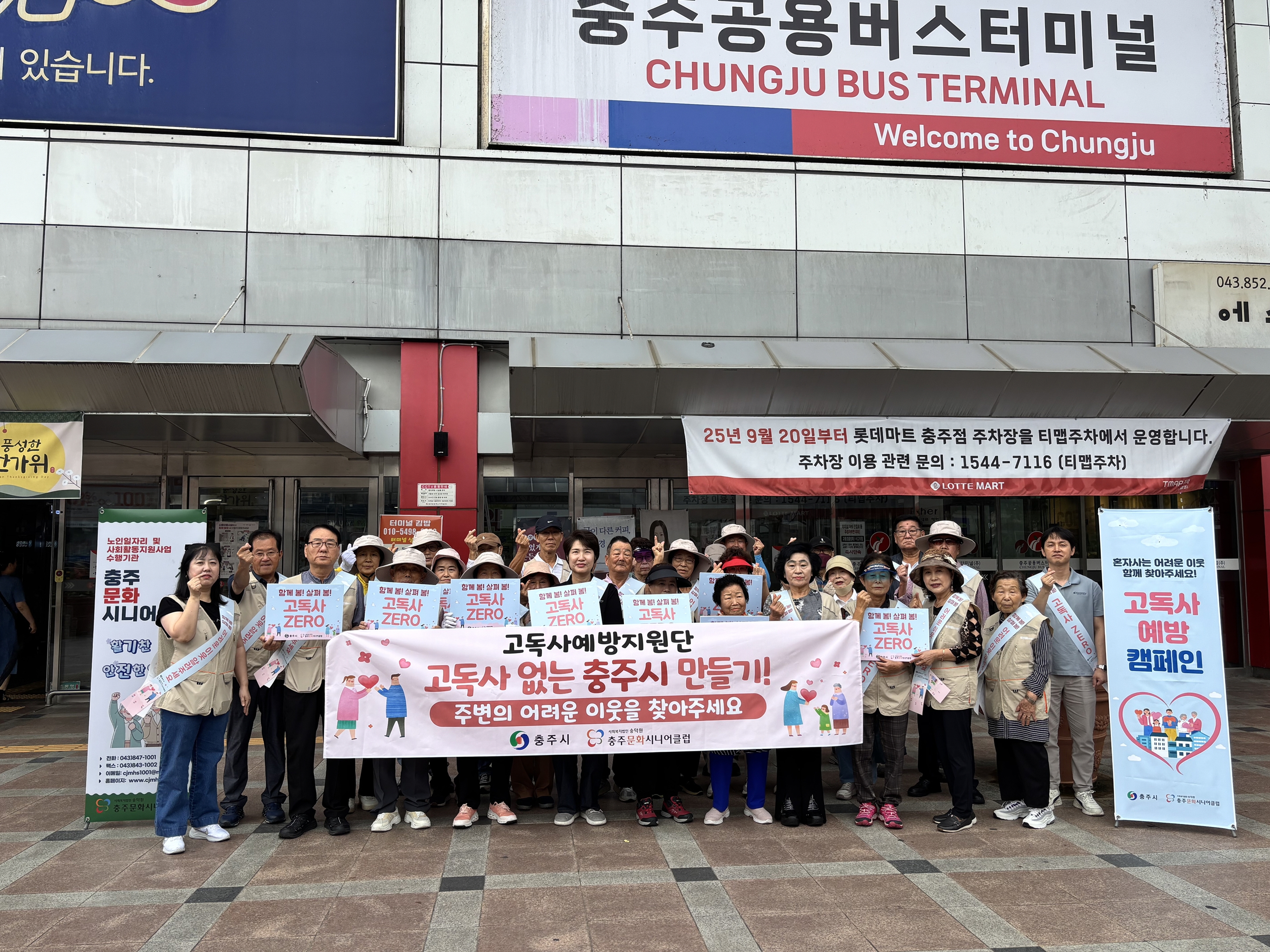 충주문화시니어클럽(관장 박보경)은 19일 충주시 칠금동 롯데마트 앞에서 고독사 예방 및 사회적 고립가구 발굴을 위한 거리 홍보 캠페인을 진행했다.