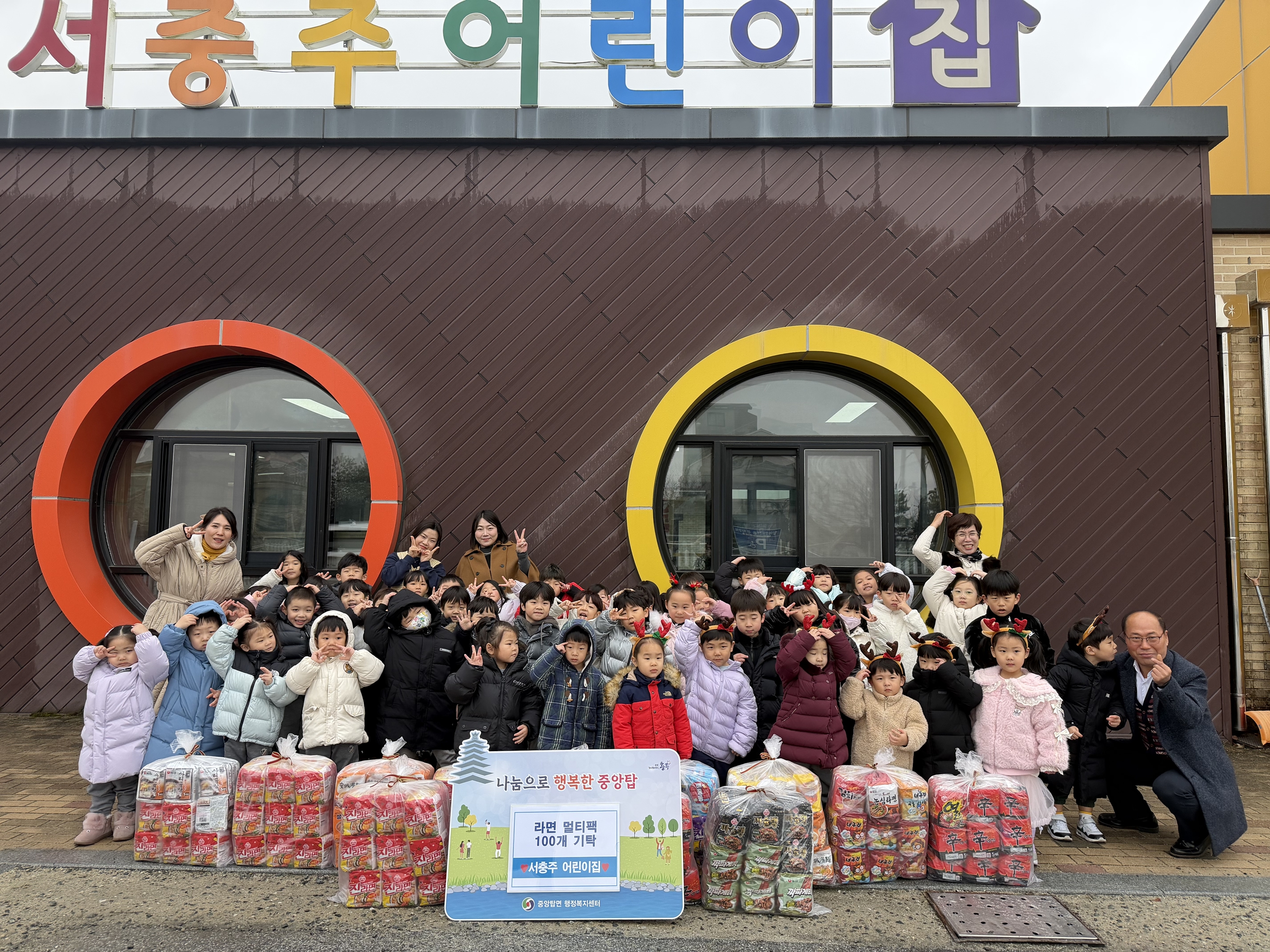 서충주어린이집(원장 이미훈) 또한 원아들이 각 가정에서 라면 한 봉지씩을 가져와 모은 라면 멀티팩 100개를 따뜻한 마음과 함께 기탁했다.