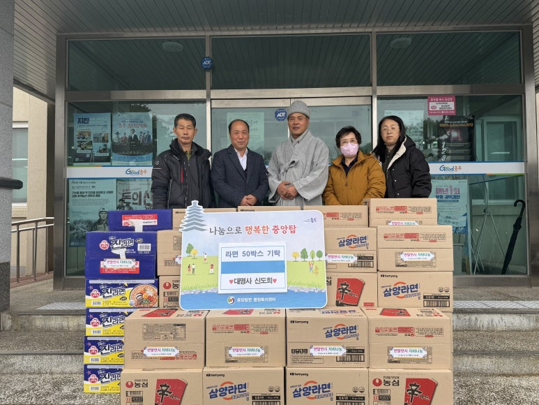 중앙탑면에 있는 대명사(주지 혜묵 스님, 신도회 회장 최원식)는 저소득 가구를 위해 라면 50박스를 중앙탑면 행정복지센터(면장 이준열)에 전달했다.