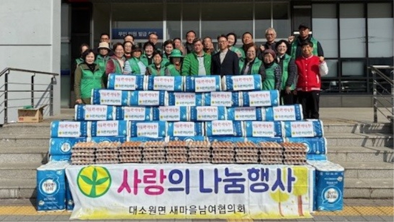 충주시 대소원면 새마을남녀협의회(회장 김학기⋅유영경)는 6일 대소원면 관내 경로당 39개소에 휴지 30롤 100개, 계란 30구 50판을 기부했다고 밝혔다.