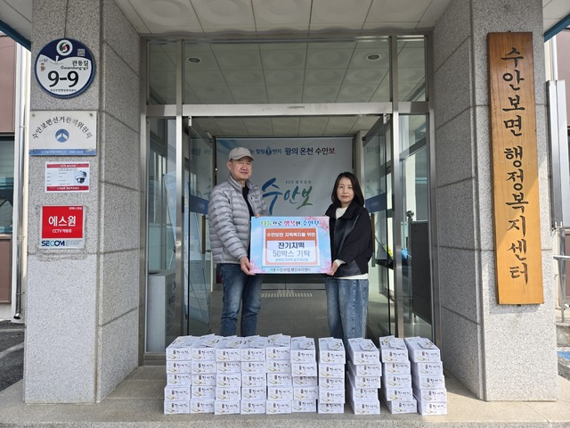류주연 수안보면장은 “따뜻한 나눔을 실천해주신 송화잔기지떡 대표님께 깊이 감사드린다”며 “기탁해주신 마음이 잘 전달될 수 있도록 면에서도 최선을 다하겠다”고 밝혔다.